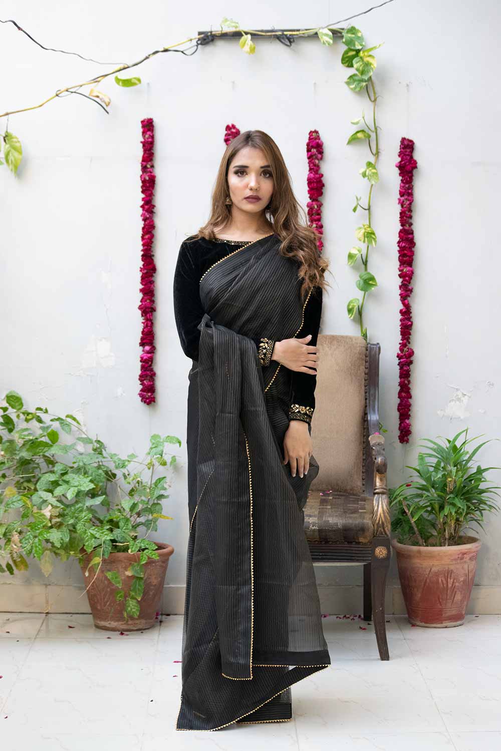 BLACK LINES SAREE WITH VELVET BLOUSE